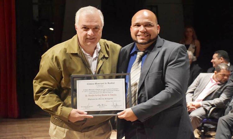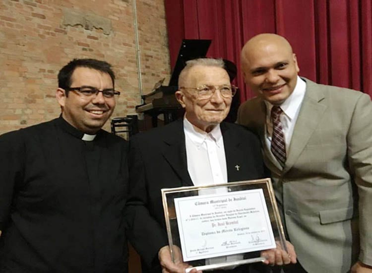 Na sessão da Câmara Municipal de Jundiaí da noite de ontem, o Padre José Brombal, 90 anos, foi homenageado com o diploma de Mérito Religioso. A iniciativa foi do Vereador Douglas do Nascimento Medeiros. A cerimônia foi realizada no Teatro Polytheama e no total 41 pessoas foram homenageadas.