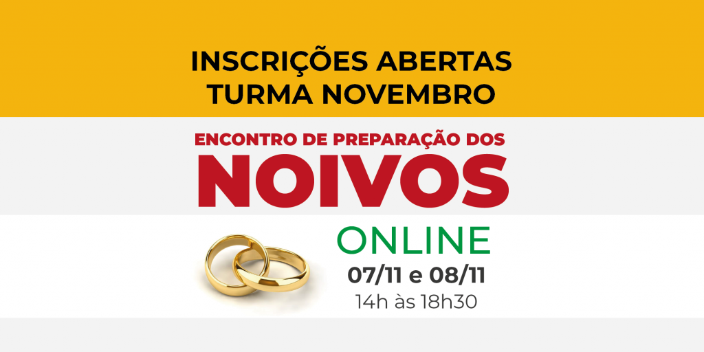 A Pastoral Familiar, realizará outra Preparação de Noivos Online, nos dias 07 e 08 de novembro de 2020. INSCRIÇÕES: de 21/10 a 04/11. Link de inscrição é: https://www.sympla.com.br/preparacao-dos-noivos—diocese-de-jundiai__1018526