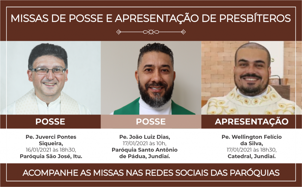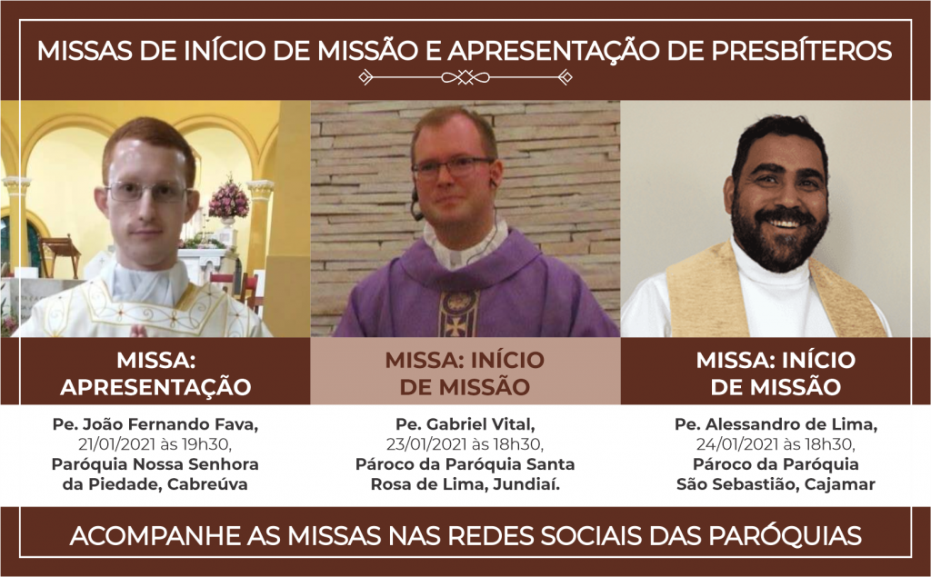 Nesta semana, nos dias 21, 23 e 24, três paróquias da Diocese de Jundiaí acolherão seus novos presbíteros. As celebrações serão presididas pelo Bispo Dom Vicente Costa. Nesta quinta-feira, (21), às 19h30, o padre João Fernando Fava será apresentado aos paroquianos da Paróquia Nossa Senhora da Piedade, em Cabreúva. Padre João Fernando assumirá o ofício […]