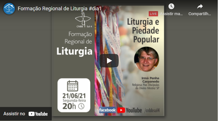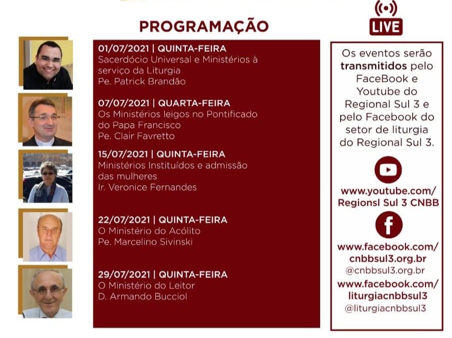 Seminário Regional do Sul 3 sobre Liturgia Tema: Ministérios leigos à serviço da Liturgia 01, 07, 15, 22 e 29 de julho às 20h Online, gratuito, sem necessidade de inscrição