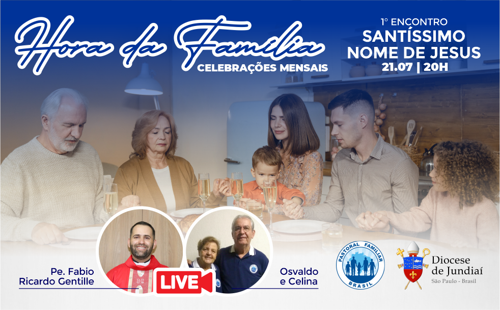 Acompanhe a live que o Padre Fábio Ricardo Gentille fará nesta quarta-feira (21), às 20h, com o casal Osvaldo e Celina, da Pastoral Familiar. Hora da Família (encontros mensais) Tema: Santíssimo nome de Jesus