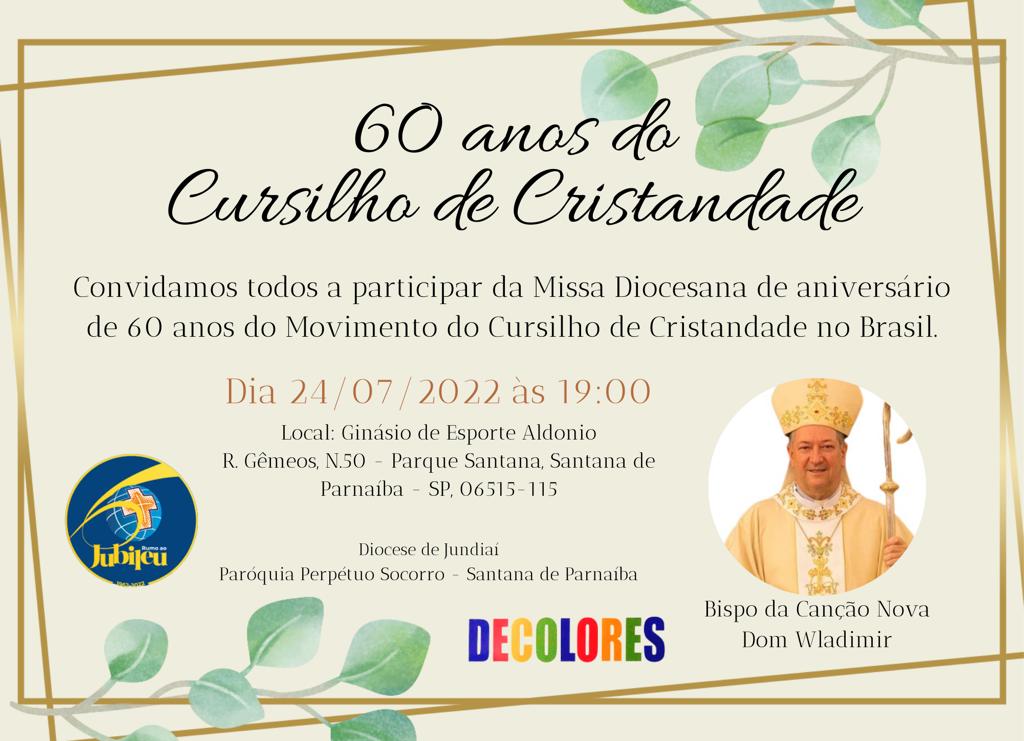 O Movimento Cursilho de Cristandade completa 60 anos e vai comemorar a data com Missa no próximo dia 24 de julho, às 19h. Local: Ginásio de Esportes do Colégio Municipal Aldonio Ramos Teixeira, na R. Gêmeos, 50, Parque Santana, em Santana de Parnaíba. Presidente da Celebração: Dom Joaquim Wladimir Lopes Dias, Bispo de Lorena (SP) Todos são […]