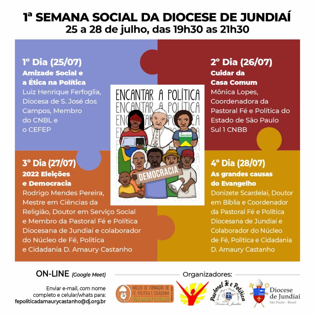 Atendendo a um apelo do Papa Francisco que convoca cada cristão para ser protagonista da renovação da Igreja e da nossa sociedade civil, o Núcleo Diocesano de Formação Fé, Politica e Cidadania Dom Amaury Castanho convida para a Formação sobre “Encantar a Política”. Dias: 25 a 28 de julho Aulas on line É urgente a […]