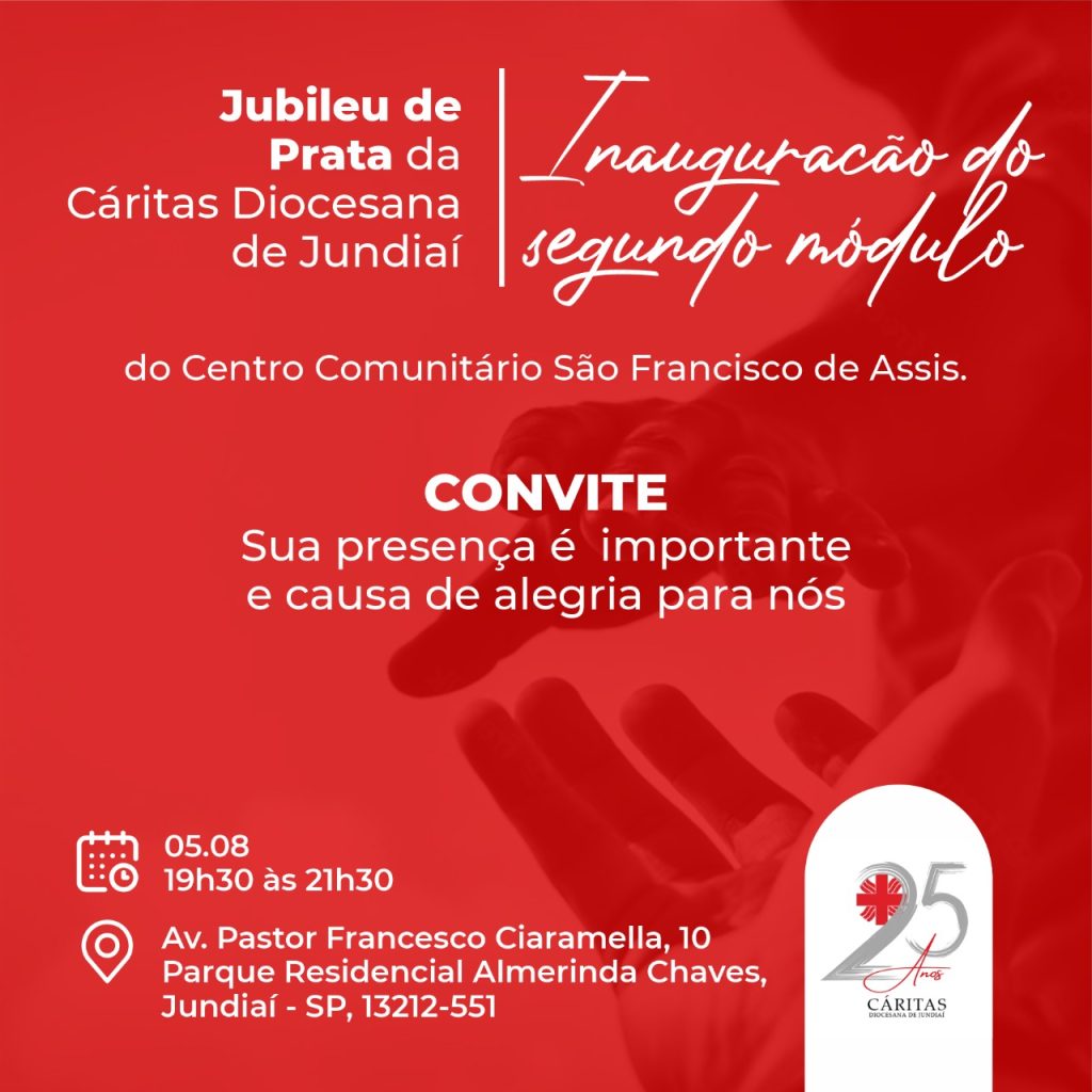 A Cáritas Diocesana de Jundiaí convida para Inauguração do segundo módulo do Centro Comunitário São Francisco de Assis. Data: Amanhã, 5 de agosto Horário: às 19h30 Local: centro Comunitário São Francisco de Assis, na Avenida Pastor Francesco Ciaramella, 10, no Parque Residencial Almerinda Chaves, em Jundiaí. Todos são convidados!
