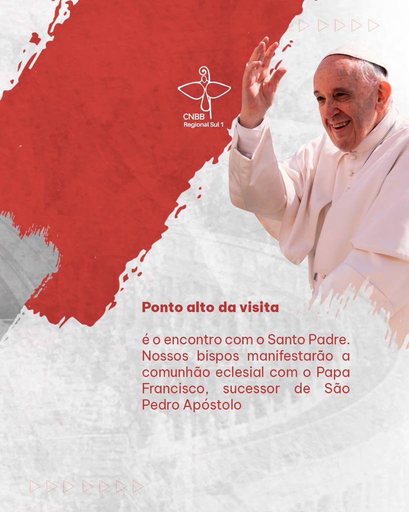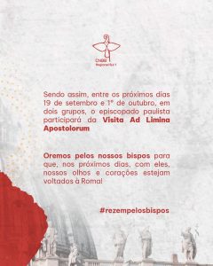 Nosso convite aos agentes de pastoral e a todo povo fiel é de orar pelos nossos bispos para que, nos próximos dias, com eles, nossos olhos e corações estejam voltados à Roma e, desta amada cidade, de onde o Papa Francisco pastoreia toda a Igreja, recebamos “luz, orientação, conforto e apoio” (Nota Espiritual-Pastoral do Diretório da Visita Ad Limina, 1988) para seguirmos a missão evangelizadora no Regional Sul 1 da CNBB!
