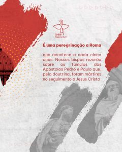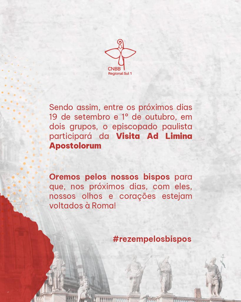 Assim, entre os próximos dias 19 de setembro e 1º de outubro, em dois grupos, o episcopado paulista participará da Visita Ad Limina Apostolorum. De tradução literal latina, Visita aos Túmulos dos Apóstolos, os bispos do Regional Sul 1, como legítimos sucessores dos apóstolos, para o bem de suas dioceses e de toda a Igreja (Diretório da Visita Ad Limina, n. 1.1, 1988), manifestarão a comunhão eclesial com o Papa Francisco, sucessor de São Pedro Apóstolo.