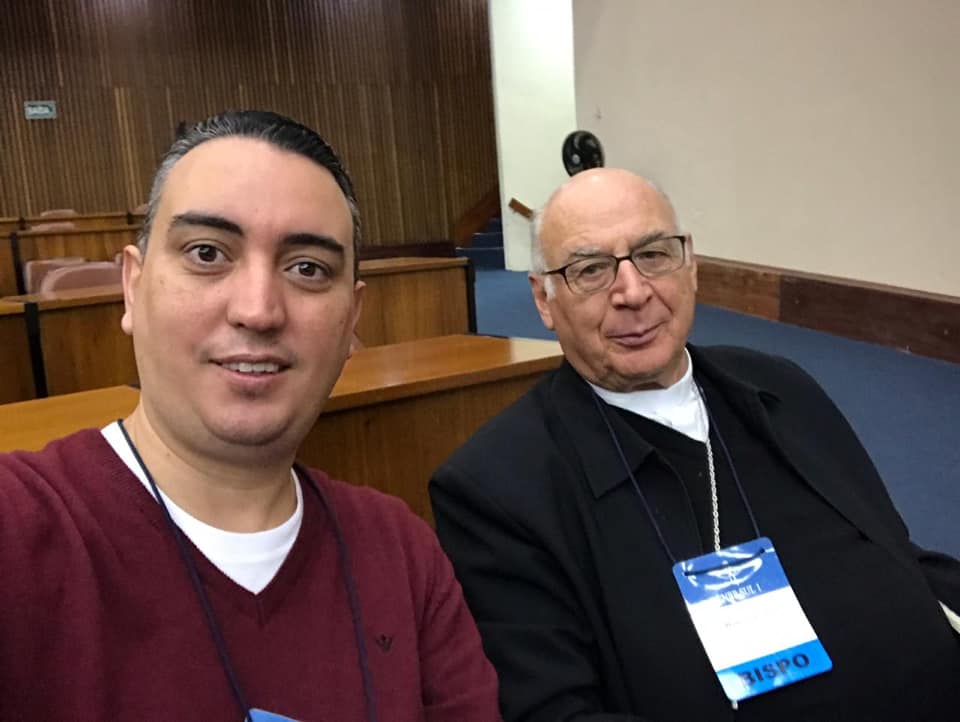 Padre Leandro Megeto, coordenador diocesano da Ação Evangelizadora, participa da Assembleia com Dom Vicente.