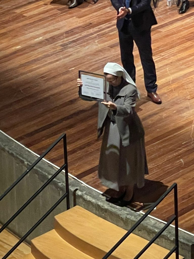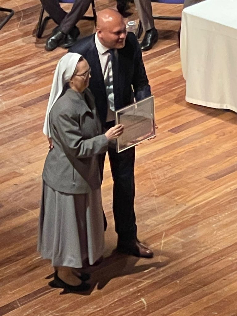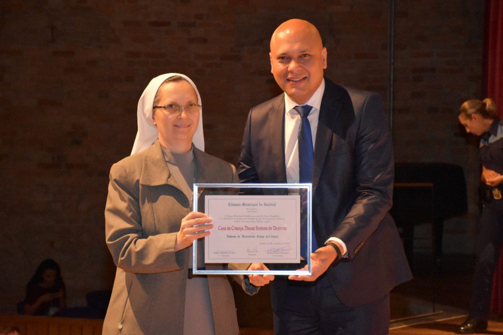 Irmã Alcinda Primon, CMC, representou a Casa da Criança, que recebeu o Diploma de Benemérito Amigo da Criança. O reconhecimento partiu da indicação do vereador Douglas Medeiros.
