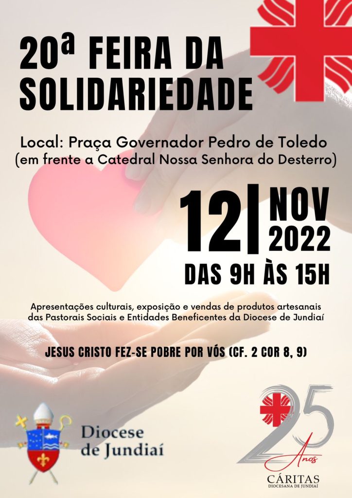 A Cáritas Diocesana de Jundiaí convida para a 20ª Feira da Solidariedade, que acontece neste sábado, dia 12 de novembro, a partir das 9h, na Praça Governador Pedro de Toledo ( Praça da Catedral Nossa Senhora do Desterro), em Jundiaí.