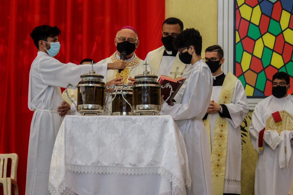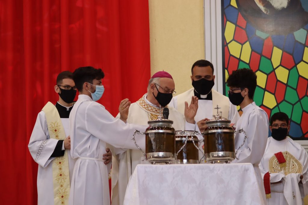 Outro momento importante desta celebração é a benção e consagração dos Santos Óleos usados nos sacramentos. O Bispo Diocesano explicou o significado de cada um deles: