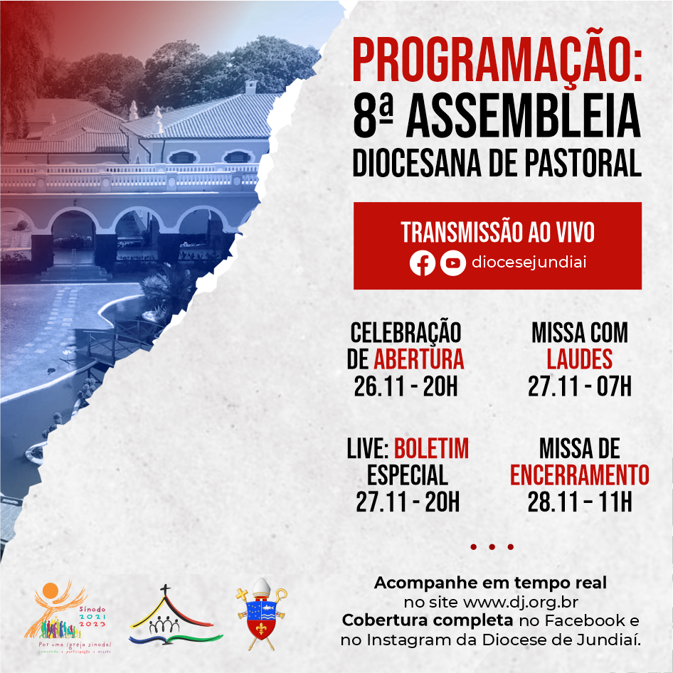 A 8ª Assembleia de Pastoral da Diocese de Jundiaí tem início neste dia 26 de novembro, às 20h, no Mosteiro de Itaici (Indaiatuba, SP). Conduzida por Dom Vicente Costa, Bispo Diocesano, e Padre Leandro Megeto, coordenador da Ação Evangelizadora, o evento reúne o clero diocesano, seminaristas, delegados paroquiais, lideranças e representantes de novas comunidades, carismas, movimentos e religiosos de toda a Diocese. Sob a luz do Espírito Santo, o objetivo é definir o Plano da Ação Evangelizadora da Diocese de Jundiaí para os próximos dois anos. O trabalho resultante desta Assembleia formará também o documento da Etapa Diocesana do Sínodo dos Bispos que acontecerá no Vaticano em 2023.