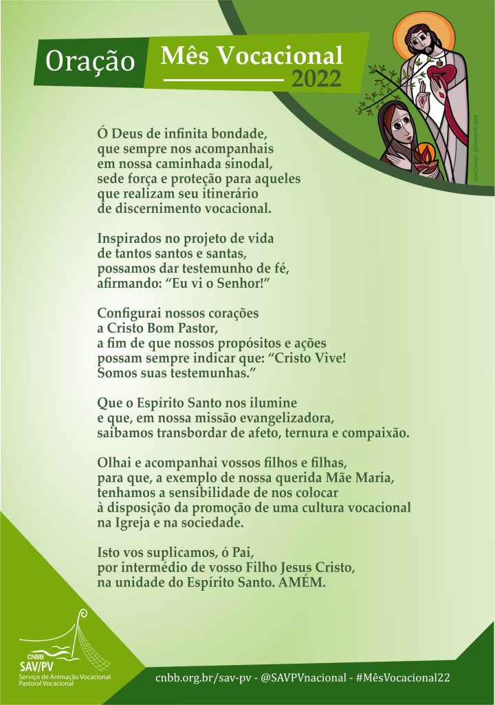 Neste ano de 2022, o tema escolhido pela Comissão para os Ministérios Ordenados e a Vida Consagrada da Conferência Nacional dos Bispos do Brasil (CNBB) para celebrar o Mês Vocacional é “Cristo Vive! Somos suas testemunhas” e o lema é “Eu vi o Senhor!” (Jo 20,18).