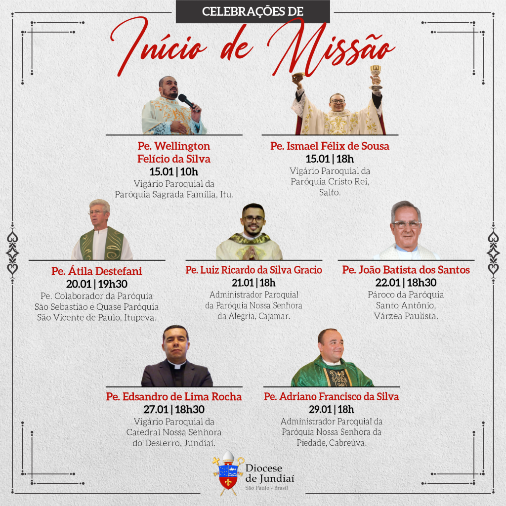 Anunciamos, a seguir, o calendário das celebrações eucarísticas previstas para este mês de janeiro de 2023, que marcam o início de missão de presbíteros recém transferidos e ou nomeados por Dom Arnaldo, Bispo Diocesano.