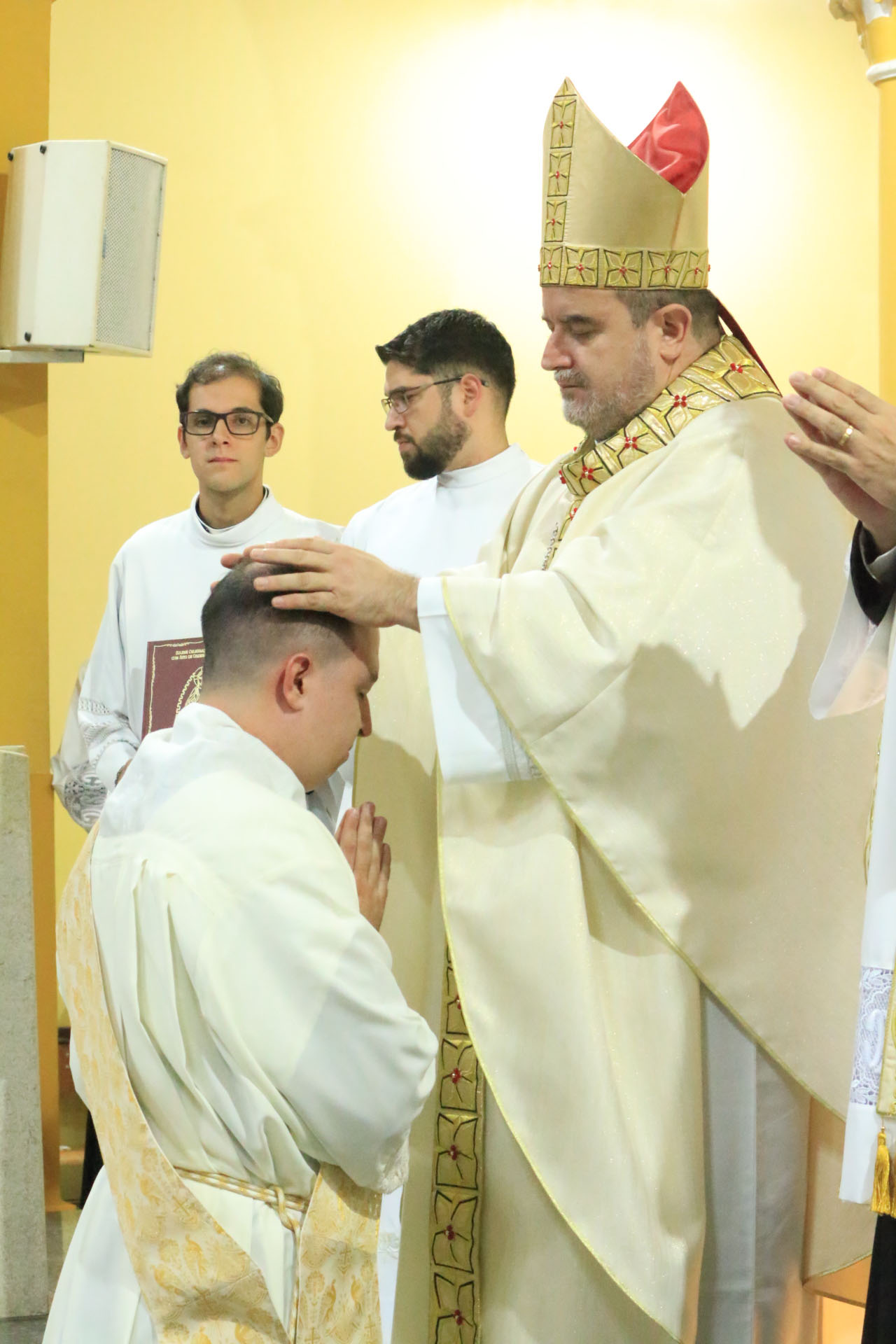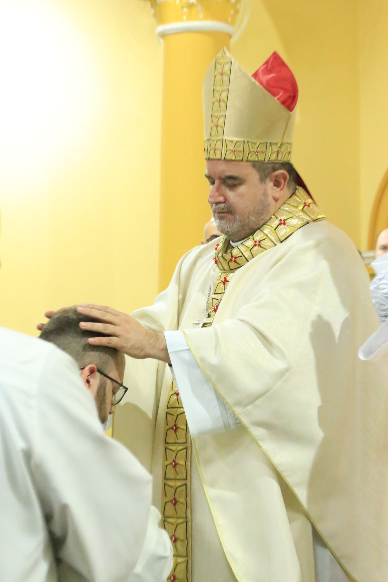 Bruno e Leonardo manifestaram publicamente seu desejo e compromisso de servir ao Povo de Deus. Em seguida, a assembleia rezou a ladainha dos santos invocando a intercessão dos santos, pedindo a proteção e a ajuda divina para os candidatos. Com a Imposição das mãos e prece de ordenação, Dom Arnaldo suplicou a ação do Espírito santo sobre Bruno e Leonardo, a quem conferiu o ministério sacerdortal.