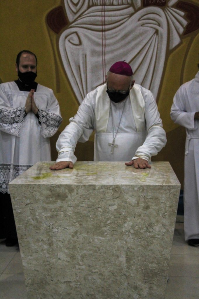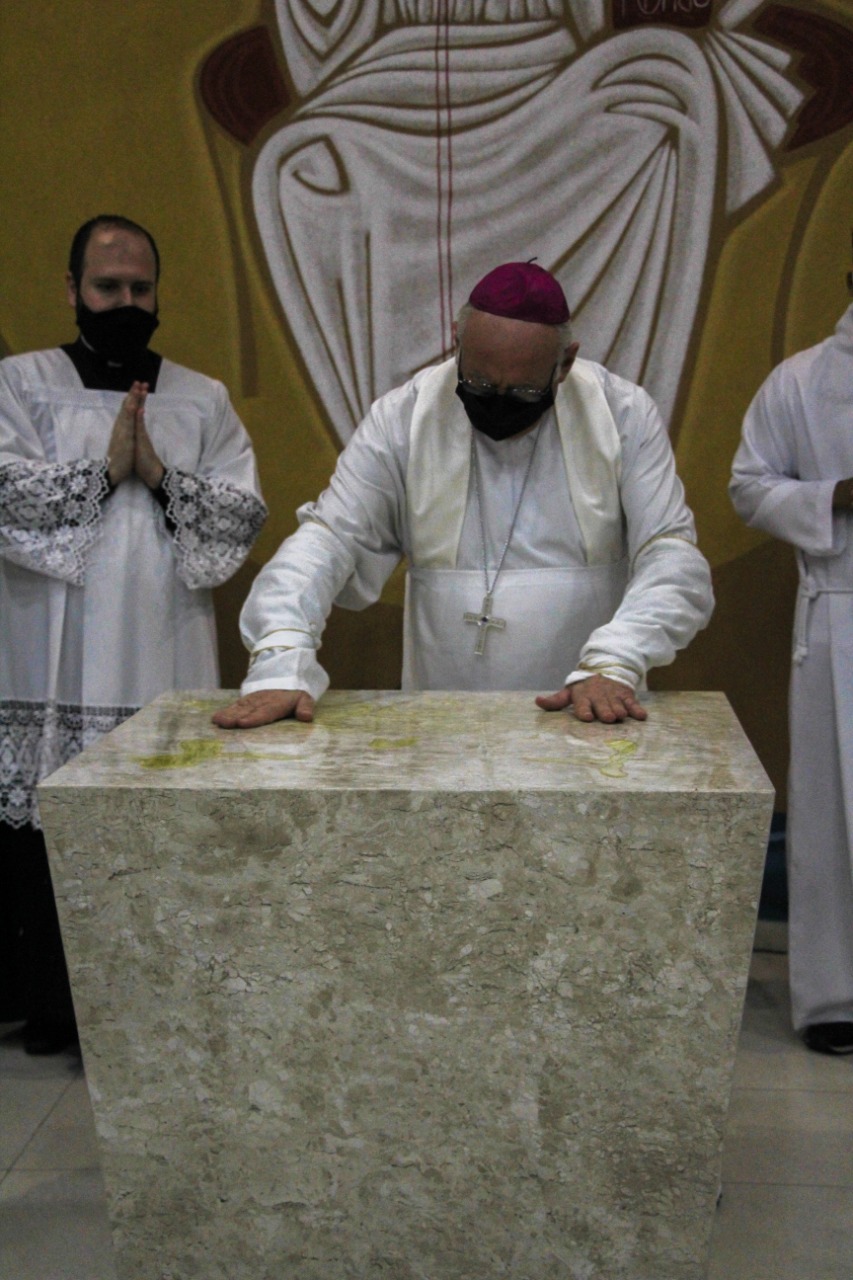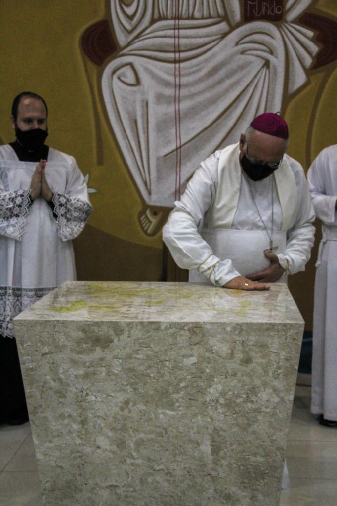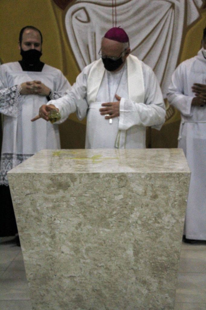 Após a homilia, teve início o rito de Dedicação, onde o altar foi ungido com o Santo Crisma, depois houve a consagração da Igreja e quatro cruzes foram ungidas, significando que o Templo é dedicado exclusivamente e sempre ao culto cristão. Os ritos da unção exprimem, em sinais sensíveis, alguns aspectos daquela obra invisível que o Senhor realiza por meio da Igreja quando ela celebra os divinos mistérios, principalmente a Eucaristia. Em seguida, foi feito a incensação do altar, significando o sacrifício de Cristo e utilizado para expressar que o sacrifício da Igreja e as orações dos fiéis chegam a Deus. Depois, ocorreu o revestimento do altar, indicando que aquele local é altar do sacrifício e, ao mesmo tempo, a mesa do Senhor, onde é celebrada a morte e ressurreição de Cristo. Por fim, a Igreja voltou a receber a iluminação, apagada desde o início do rito, para recordar que Cristo é a Luz que se revela às nações. Terminado o rito, Dom Vicente prosseguiu com a liturgia eucarística.