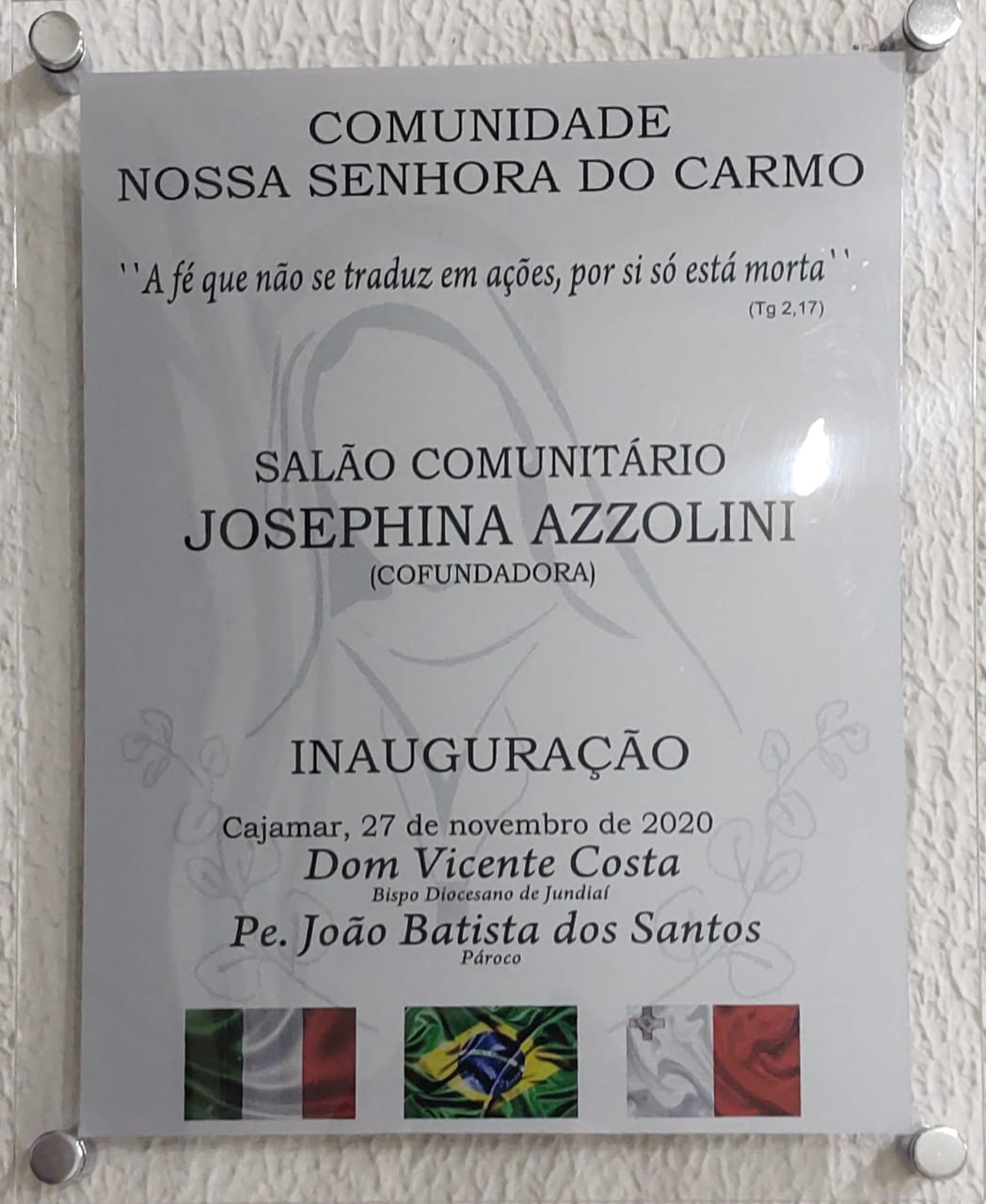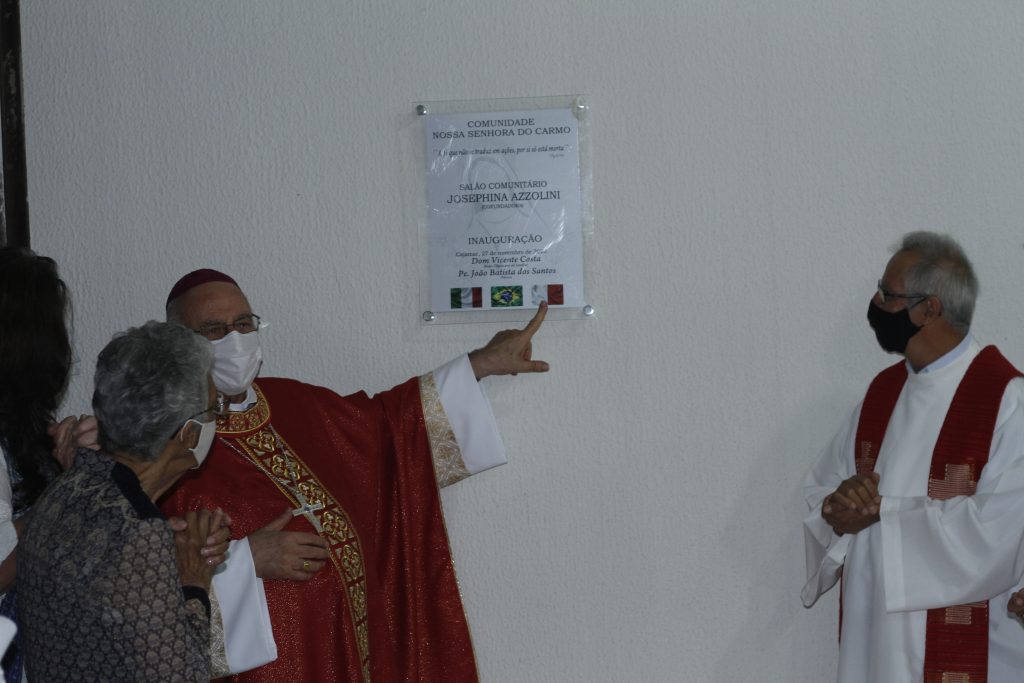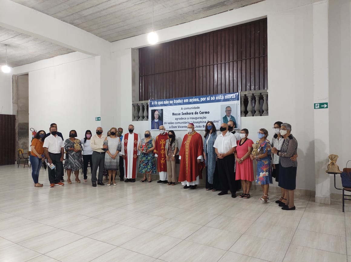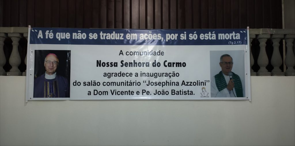 Motivo de festa entre os fiéis, o Salão Comunitário recebeu o nome de “Josephina Azzolini”, missionária leiga e cofundadora da Comunidade Nossa Senhora do Carmo, que pertence a Paróquia Nossa Senhora da Alegria. A obra é fruto da dedicação e zelo dos paroquianos que se empenharam para a construção do espaço.