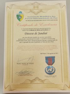 O Bispo Diocesano, Dom Vicente Costa, recebeu na noite desta terça-feira, 17 de agosto, a Menção Honrosa pelo trabalho realizado pela Diocese de Jundiaí durante a pandemia. A cerimônia foi promovida pela Associação Brasileira das Forças Internacionais de Paz e o CONSEG Jundiaí Leste (ABFIP) e a honraria, denominada “Medalha Heróis Covid” foi destinada a autoridades representantes de diversos segmentos da sociedade jundiaiense. No total, foram entregues 14 medalhas.