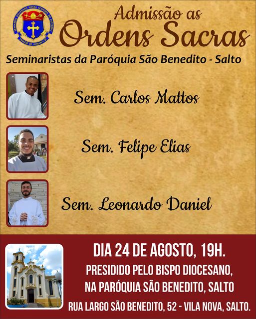 Nesta terça-feira, dia 24 de agosto, os seminaristas Carlos Mattos, Felipe Elias e Leonardo Daniel serão admitidos às Ordens Sacras, durante Celebração Eucarística presidida pelo Bispo Diocesano, Dom Vicente Costa.