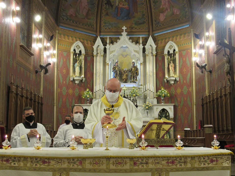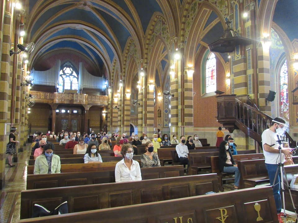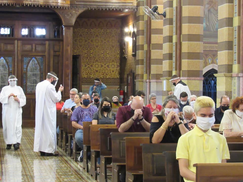 Pela primeira em mais de 80 dias, fiéis participaram presencialmente da celebração na Igreja matriz, mãe da Diocese de Jundiaí. No total 70 pessoas participaram cumprindo rigorosamente todas as normas e exigências sanitárias, como o uso de máscaras, higienização do local, distância entre os fiéis.
