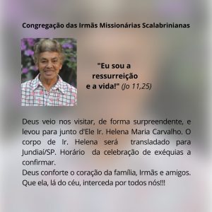 O Instituto São Carlos comunica com pesar e tristeza, o falecimento de Ir. Helena Maria de Carvalho, residente na casa provincial, ocorrido hoje, na cidade de Bonito (MS), de acidente.