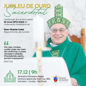 Dom Vicente Costa, Bispo emérito de Jundiaí, completa 50 anos de vida sacerdotal. Para celebrar essa data especial, a Diocese de Jundiaí tem a alegria de convidar todos os fiéis diocesanos para a Solene Celebração Eucarística pelo Jubileu de Ouro Sacerdotal de Dom Vicente.