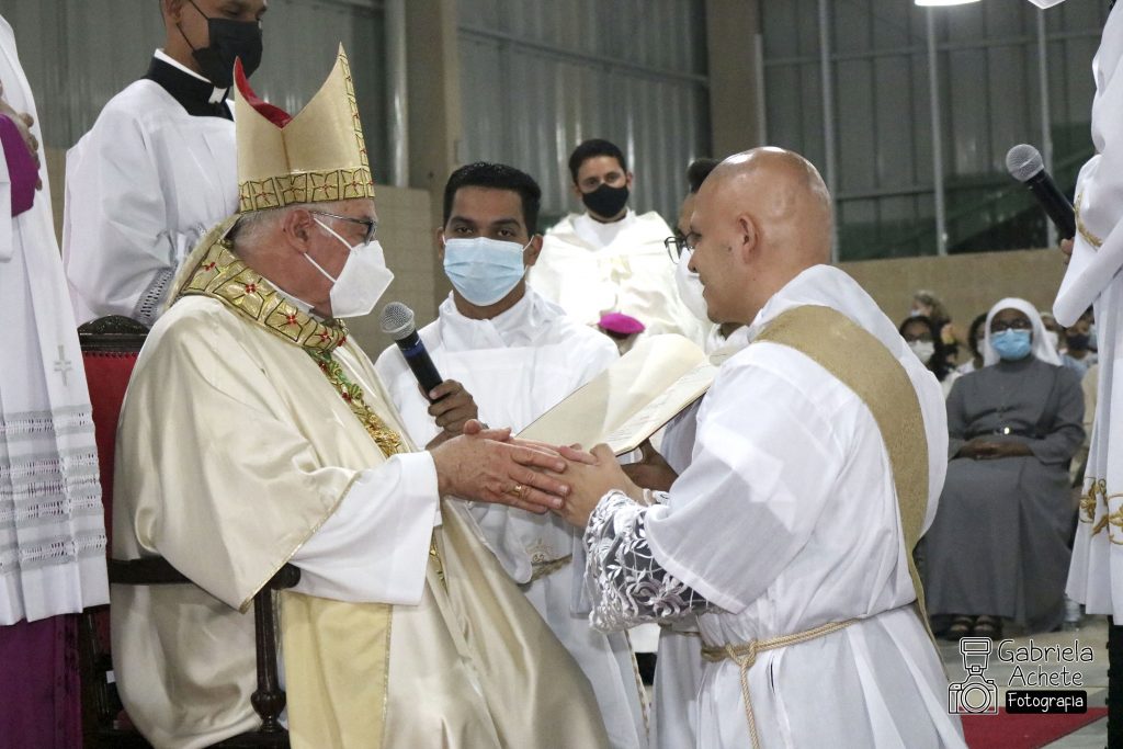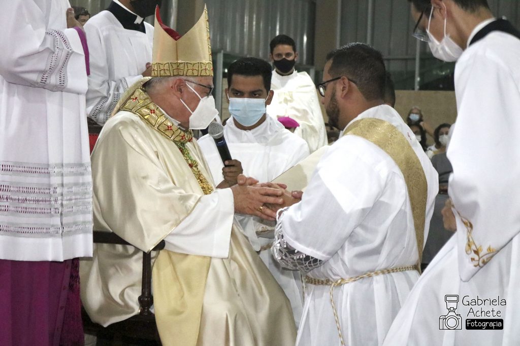 Em sua homilia, Dom Vicente, dirigindo-se especialmente aos dois jovens, falou da importância de receber o segundo grau do Sacramento da Ordem, o presbiterado: “O Senhor os escolheu para seus ministros ordenados”, e destacou que “o dom que recebestes vem do amor e da misericórdia de Deus. Por isso, perseverem até o fim de seus dias”.