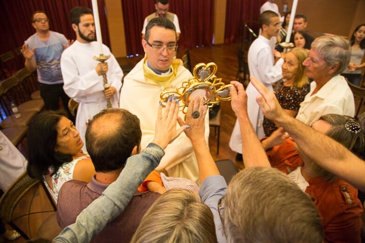 A celebração também contou com a bênção com o Santíssimo Sacramento, momento em que padre Leandro percorreu o Espaço da celebração levando o ostensório para perto das famílias dos trabalhadores. Nessa hora, carteiras de trabalho, fotos e outros objetos pessoais foram levantados para serem abençoados.