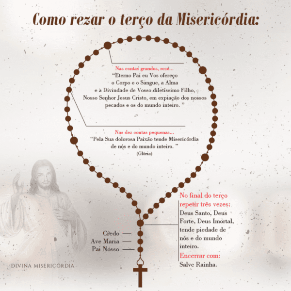 O Terço da Divina Misericórdia é comumente rezado às 15h – Hora da Misericórdia – momento em que Cristo entregou sua vida na cruz – podendo ser rezado a qualquer hora.  Se utiliza das mesmas contas do rosário tradicional, mas com orações específicas focadas na misericórdia de Deus. Confira: