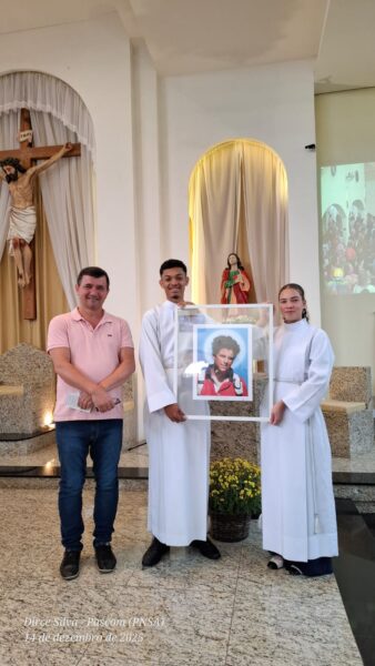 FOTO EM DESTAQUE: Padre Ton com o casal Antônio Padovani e Teresa Padovani, que estiveram na canonização de Carlo Acutis, e doaram o ícone de São Carlo Acutis para a Paróquia, e o vereador Eduardo Alves, autor do projeto para nomeação da Rua Carlo Acutis.