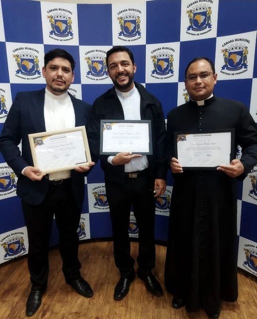 Os padres Jonatas Rodrigues da Silva, Administrador Paroquial da Paróquia Nossa Senhora do Rosário; Rafael de Araújo Santos, Vigário Paroquial da Paróquia Sant’Ana, e Erickson Ramos da Silva, Pároco da Paróquia São Pedro receberam moção de aplausos em alusão ao Dia do Padre.