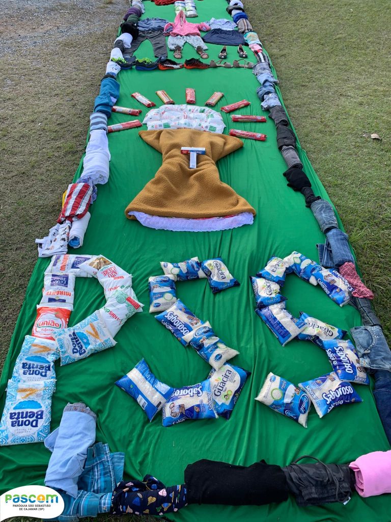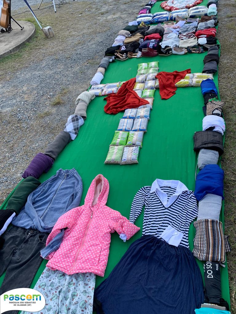 Em Cajamar, a Paróquia São Sebastião realizou, pela primeira vez, o tapete solidário. E em apenas 15 dias a comunidade arrecadou uma enorme quantidade de alimentos e agasalhos, cerca de uma tonelada, que estiveram presentes na confecção do tapete.