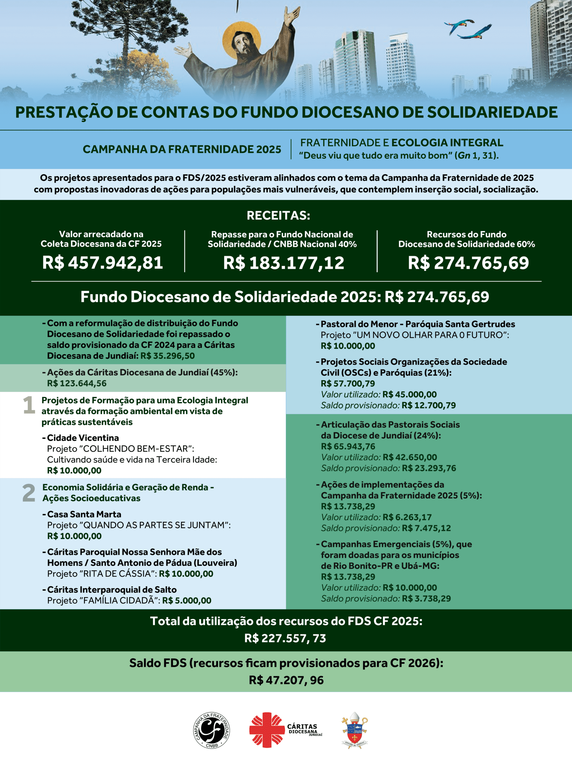 Do total arrecadado, 60% dos recursos permanecem em nossa Diocese. Esse valor compõe o Fundo Diocesano de Solidariedade (FDS) e é destinado a projetos locais que atendem pessoas em situação de vulnerabilidade. Na Diocese de Jundiaí, os projetos contemplados atuam em frentes essenciais, como o cuidado com idosos, o apoio a famílias atípicas, a promoção humana de crianças e adolescentes e o resgate da dignidade de populações marginalizadas. Confira, ao final, a prestação de contas do FDS.