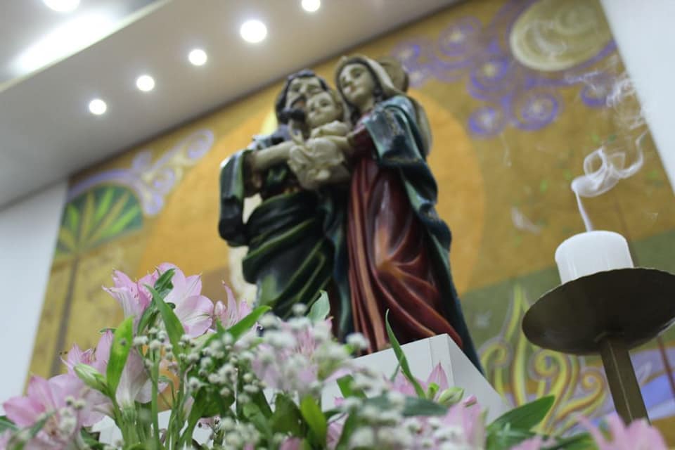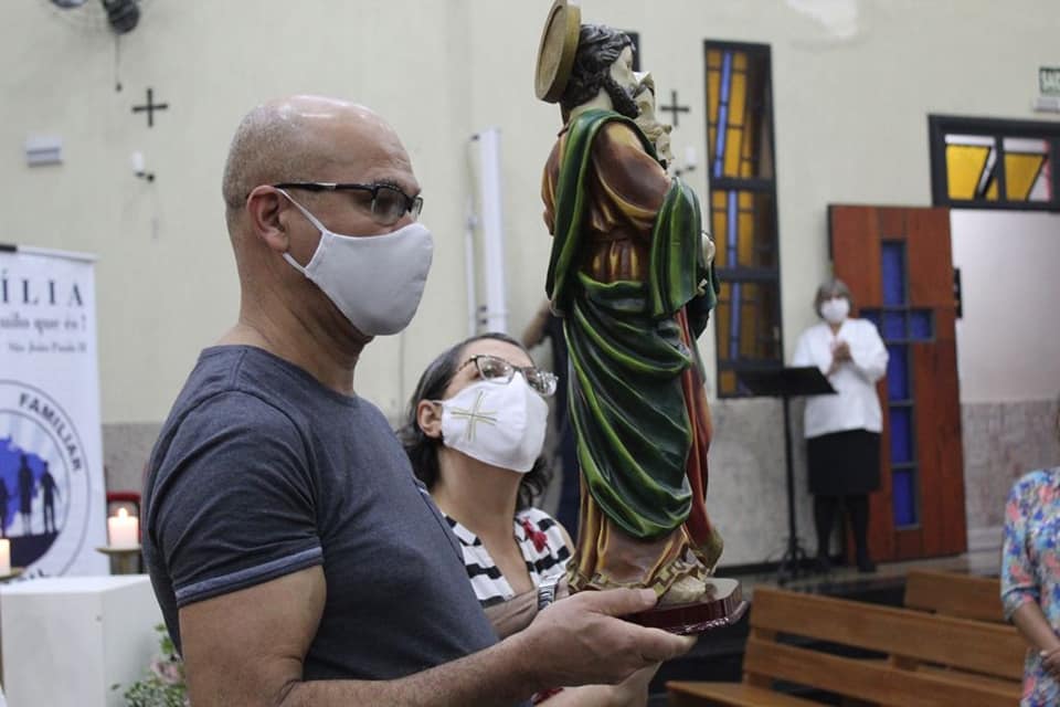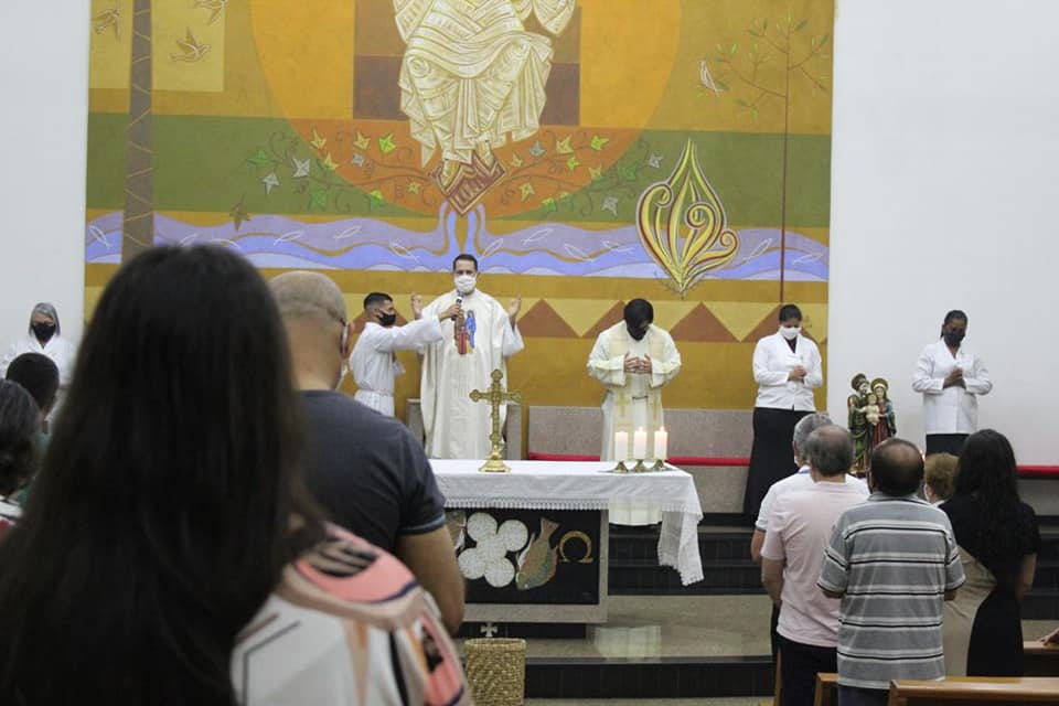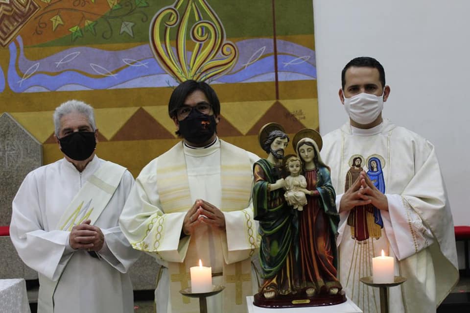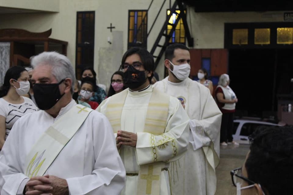 Concelebraram os Padres Fábio Ricardo Gentille, assessor eclesiástico da Pastoral Familiar, e Diego Marques Araújo, Vigário Paroquial local.