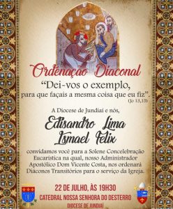 A Diocese de Jundiaí celebrará a ordenação diaconal dos seminaristas Edisandro de Lima Rocha e Ismael Félix de Sousa no próximo dia 22 de julho. A celebração será presidida por Dom Vicente Costa, na Catedral Nossa Senhora do Desterro. Na ocasião, Edisandro e Ismael, por meio da Oração Consecratória e da imposição das mãos do Bispo se tornarão diáconos, o primeiro grau do Sacramento da Ordem.